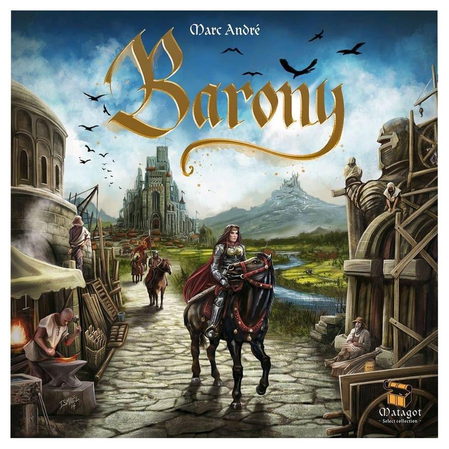 In Barony, players are ambitious barons trying to extend their dominion over the land! Who will succeed and become the new king? At the beginning of the game, players create the board at random with nine tiles per player; each tile is comprised of three hexagons, with each hexagon being one of five landscape types: forest, plains, field, mountain, lake. Players then each place three cities on the game board, with a knight in each city. They then take turns in clockwise order, with each player taking exactly one action from the six possible actions. Once any player has gained the title of duke, finish the round, then tally the VPs, with players scoring for resources still in their possession, their rank in the game, and the number of cities they built. Whoever has the most VPs wins.